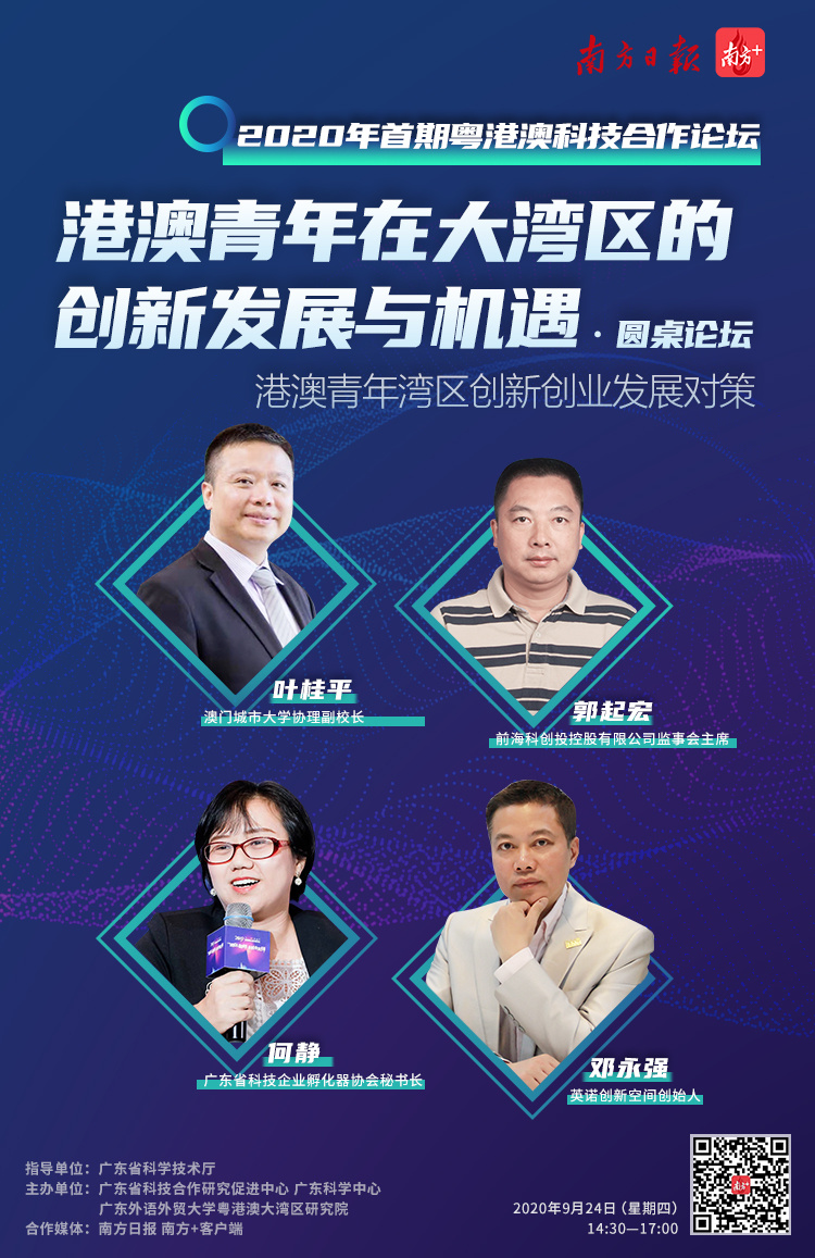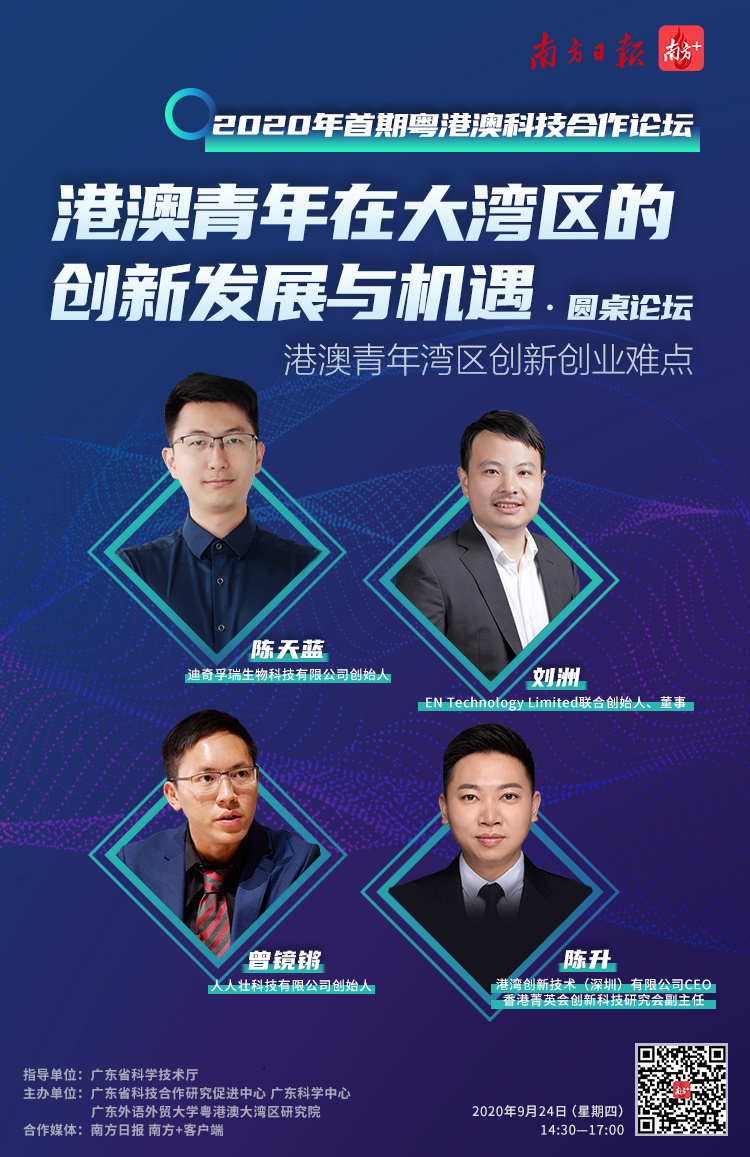 2020年9月24日,由广东省科学技术厅指导,广东省科技合作研究促进中心、广东科学中心、广东外语外贸大学粤港澳大湾区研究院联合主办的2020年首期“粤港澳科技合作论坛”在广州举行,围绕“港澳青年在大湾区的创新发展与机遇”主题,来自粤港澳三地的高校、科研机构、孵化器、科技创新服务和投融资等机构的代表以及创业青年代表约100人到场,共同为粤港澳青年创新创业建言献策,南方日报、南方+客户端作为合作媒体,提供全程现场直播。