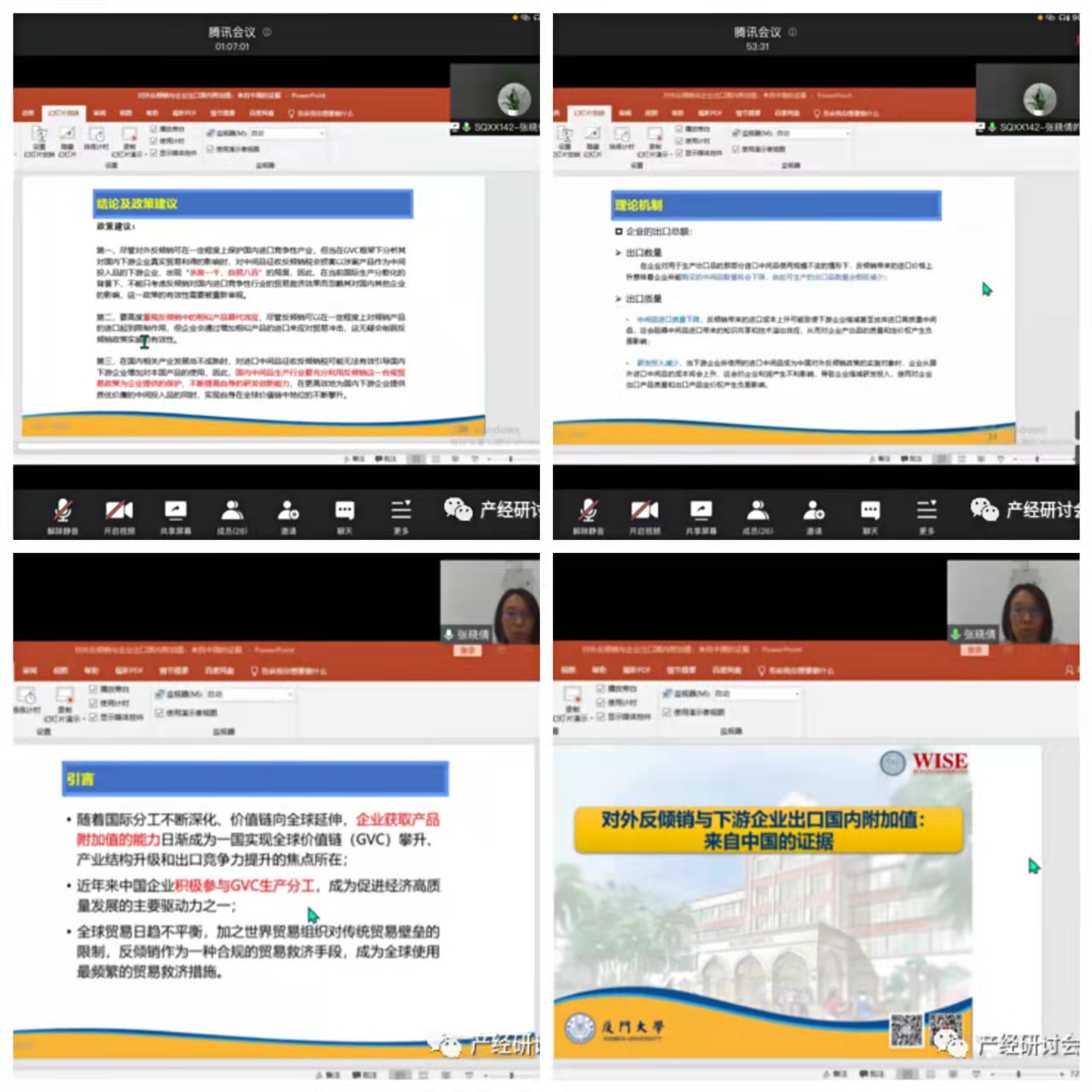 本期论坛分为论文汇报和交流讨论两个环节。首先,张晓倩博士对论文《对外反倾销与下游企业出口国内附加值:来自中国的证据》的研究背景、实证方法以及实证结果等展开了论述。汇报完毕后,张鹏清、杨永聪等老师针对张晓倩博士的论文进行了指导与点评。随后,参会的博士研究生、硕士研究生对选题思路、论文疑点与张晓倩博士进行交流讨论。至此,第3期凤凰山产经论坛圆满结束。
