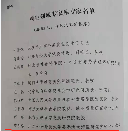 2021年11月,国务院就业工作领导小组办公室在前期各地各部门推荐的基础上,批准确定了全国范围内“就业领域专家库”首批专家名单。其中,我院院长申明浩教授入选。
