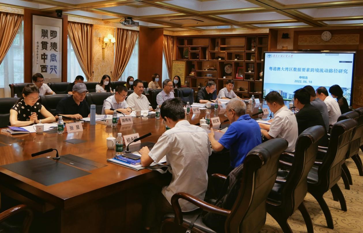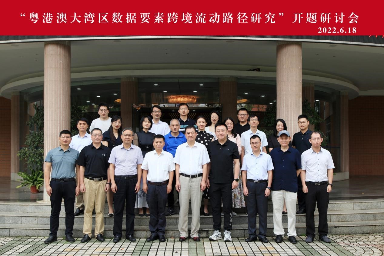 本网讯 6月18日,国家社科基金重大项目“粤港澳大湾区数据要素跨境流动路径研究”开题研讨会在我校举行。校党委副书记唐锐,广东省社科规划办主任郑红军及来自全国多所院校、科研机构和智库的专家学者出席会议,校科研处处长陈平主持会议,科研处、粤港澳大湾区研究院、法学院、信息科学与技术学院等相关单位学者及课题组成员参加会议。