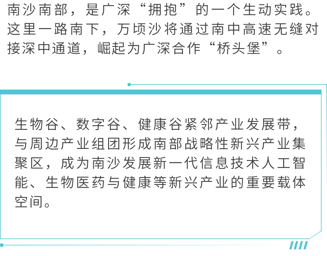 广州市南沙新区产业园区开发建设管理局相关负责人表示,他们希望持续研究规划万顷沙南部地区,打造生物谷、数字谷、健康谷与智能制造园、海洋科技城联动发展格局,高水平谋划“三谷一园一城”。
