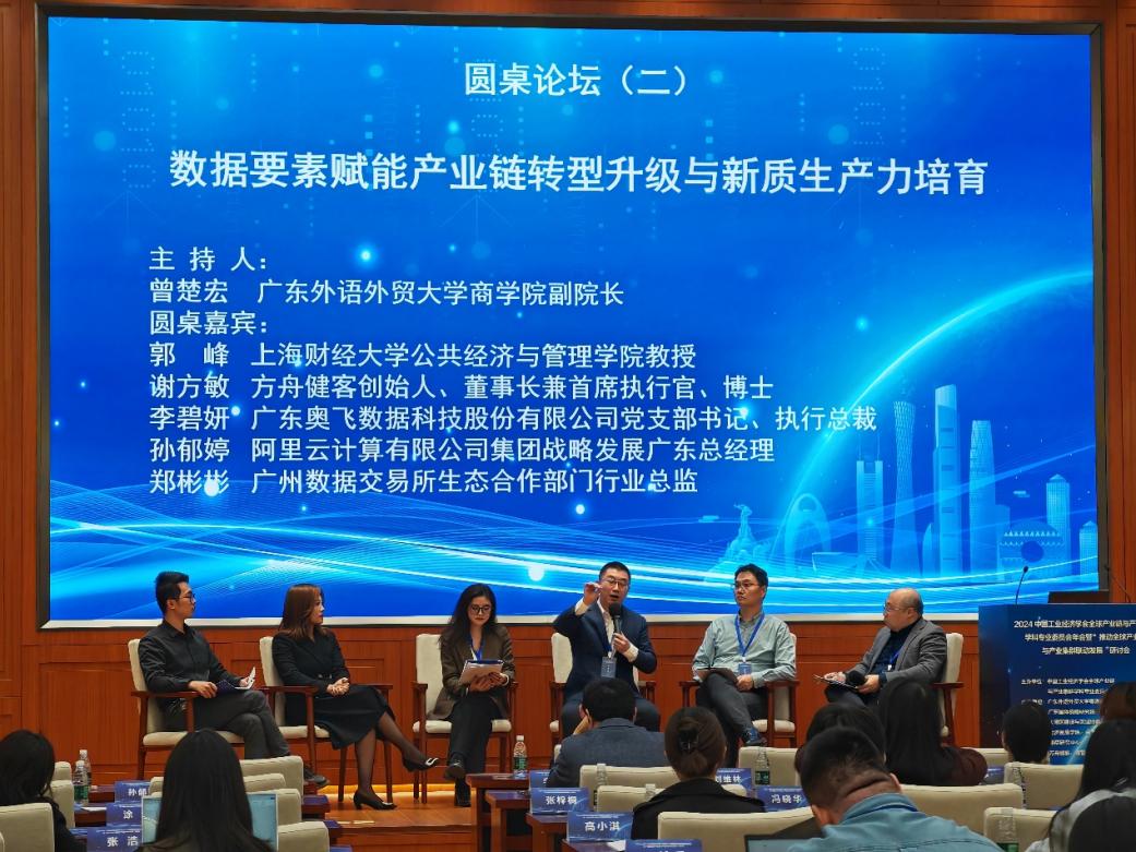 《数据要素赋能产业链转型升级与新质生产力培育》圆桌论坛由广东外语外贸大学商学院副院长曾楚宏主持,五位嘉宾从不同视角分享了数据要素的价值与应用。上海财经大学教授郭峰从理论角度阐释了数据价值的来源,强调数据汇总、加工及场景化的重要性,同时提出对数据资产入表应谨慎的建议;方舟健客创始人、董事长兼首席执行官谢方敏博士结合互联网医疗领域,讲述了如何通过药品与医生数据构建商业场景,实现数据赋能传统医疗产业;奥飞数据党支部书记、执行总裁李碧妍聚焦数据基础设施,展示了公司在算力支持、新能源布局及元宇宙生态构建方面的探索;阿里云集团战略发展广东总经理孙郁婷分享了AI大模型如何通过数据要素推动制造业升级及产业集群发展的经验;广州数据交易所生态合作部门行业总监郑彬彬从数据流通的治理角度,探讨了场内外协同机制对数据要素市场建设的促进作用。