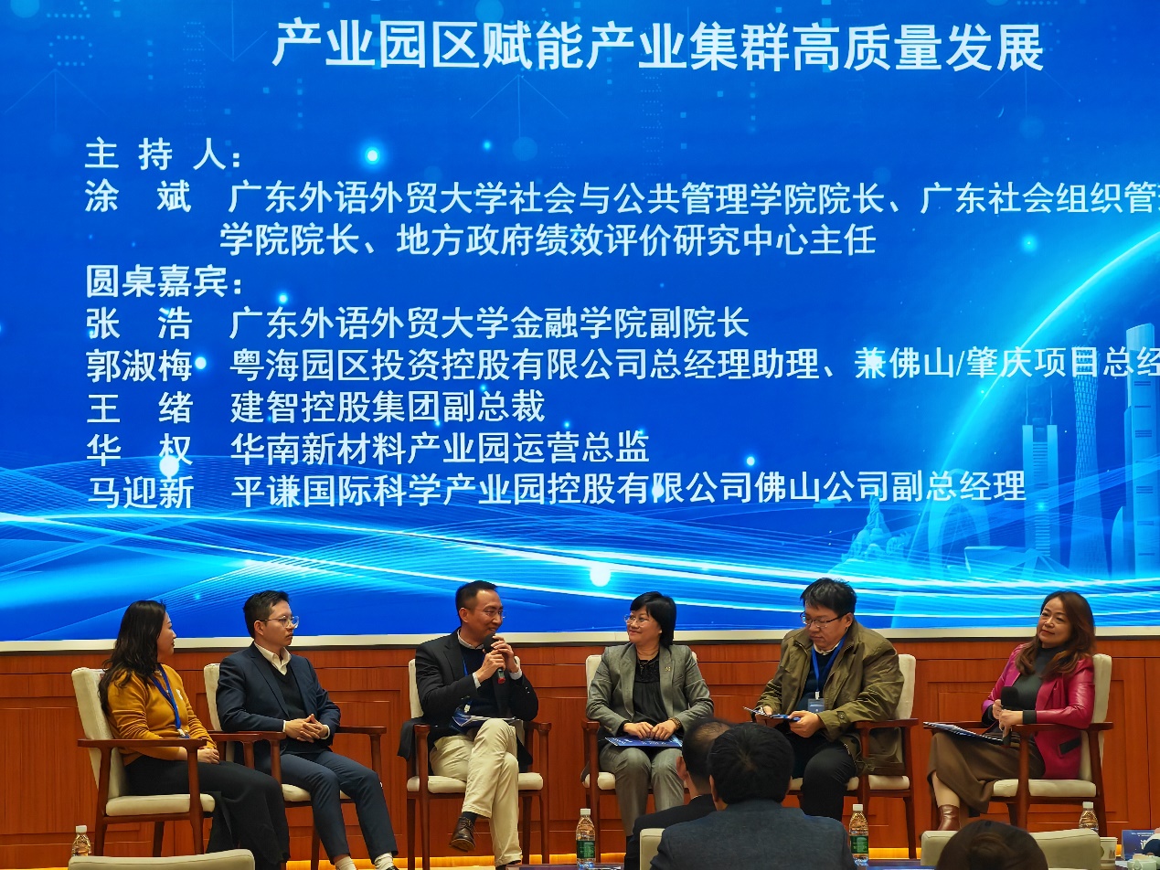 《产业园区赋能产业集群高质量发展》圆桌论坛由广东外语外贸大学社会与公共管理学院院长、广东社会组织管理学院院长涂斌主持,五位嘉宾分别从金融支持、运营实践、区域协同等不同视角进行了分享。广东外语外贸大学金融学院副院长张浩从金融与产业的结合出发,探讨如何通过创新金融工具支持龙头企业和中小企业协同发展,促进园区经济活力提升;粤海园区投资控股有限公司总经理助理郭淑梅结合实际运营,提出通过空间、资本、供应链及服务五大赋能体系支持中小制造业企业“整船出海”,展现国企担当;建智控股集团副总裁王绪以广州科学城为例,分享通过产业选择、行业服务体系构建及股权投资等手段,推动园区与城市产业协同发展;华南新材料产业园运营总监华权介绍了精装修实验室及“华交会”的创新模式,通过软硬件结合促进新材料产业创新;平谦国际科学产业园控股有限公司佛山公司副总经理马迎新强调,有必要为外资与内资企业提供金融支持和人才服务,助力区域产业链的动态调整和高质量发展。