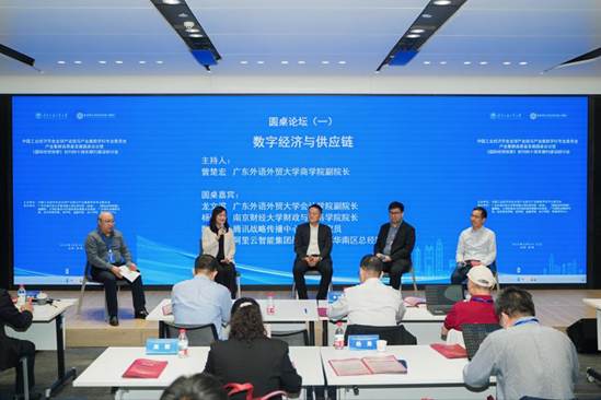 主旨演讲结束后,进入圆桌论坛环节。本次研讨会安排了两个圆桌论坛,分别围绕“数字经济与供应链”“制度型开放与企业出海”设置研讨主题。首场圆桌论坛以数字经济与供应链为主题,由广东外语外贸大学商学院副院长曾楚宏教授主持。在圆桌讨论中,广东外语外贸大学会计学院副院长龙文滨教授从欧盟碳监管新规入手,阐述了数字经济如何通过数据透明化、流程优化赋能供应链碳减排,为企业应对绿色贸易壁垒提供了微观视角。南京财经大学财政与税务学院院长杨继军教授基于其团队对中美供应链断链的研究,指出通过数字技术加强供应链安全相较于“空间重组”更具经济合理性,并提出了对企业供应链出海的关切。腾讯战略传播中心高级研究员陈创前分享了“智能经济”作为技术扩散过程的前沿观察,强调场景与应用是驱动AI技术落地的关键,并建议政策应顺应发展规律、发挥市场灵敏优势并储备好治理工具。阿里云智能集团战略发展部华南区总经理谢天则分析了中美在AI供应链领域的博弈态势,指出全栈自主可控能力的重要性,并分享了AI技术为国际贸易带来的新动能、新工具和新服务模式。