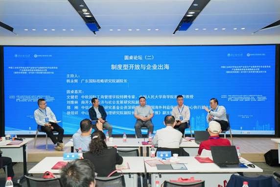 第二场圆桌论坛则聚焦“制度型开放与企业出海”,由广东国际战略研究院副院长韩永辉教授主持。中欧国际工商学院特聘专家文健君结合实战经验,系统梳理了企业从“产品出海”“产能出海”到“供应链出海”与“核心能力出海”的演进逻辑,指出供应链出海是“冰火两重天”,亟需学界总结成功要素与案例。南开大学经济与社会发展研究院副院长刘维林教授从产业升级内在逻辑出发,提出企业出海需实现从“技术应用”到“技术标准定义”、从“供应链管理”到“全球产业生态协同”、从“国内合规”到“全球合规与价值观沟通”的三重能力转变。中信改革发展研究基金会资深研究员郑刚指出,企业出海已进入风险常态化的新阶段,必须建立集地缘政治、产业规则、贸易安全于一体的风险监测预警体系,实现从“被动应对”到“主动谋划”的转变。中山大学国家治理研究院副院长徐现祥教授则从“目标引领发展”的理论视角,提出政府应通过“共识效应”“资源生成”和“锚定效应”,为企业出海超前引领、松绑赋能,并呼吁建立与高质量发展相匹配的多维指标体系。